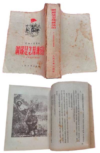 人民文学出版社1952年出版的梅益译《钢铁是怎样炼成的》封面与内文插图