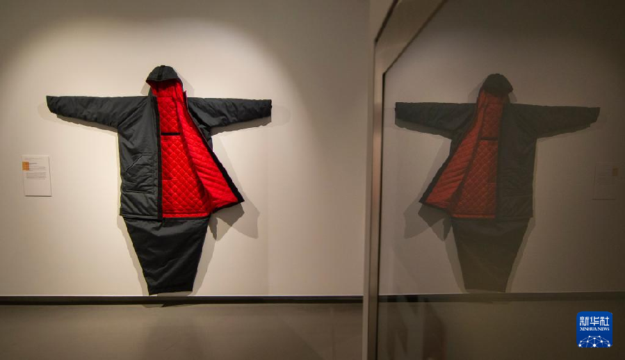 这是11月13日在加拿大多伦多举行的“生存建筑与应对的艺术”展览上拍摄的一件可变为睡袋的大衣。新华社发(邹峥摄)